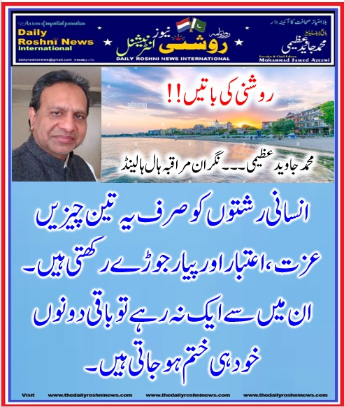 انسانی رشتوں کو صرف یہ تین چیزیں عزت، اعتبار اور پیار جوڑے رکھتی ہیں۔ ان میں سے ایک نہ رہے تو باقی دونوں خودہی ختم ہو جاتی ہیں ۔