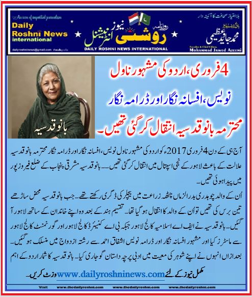 4 فروری ،اردو کی مشہور ناول نویس، افسانہ نگار اور ڈرامہ نگار محترمہ بانو قدسیہ انتقال کرگئی تھیں ۔