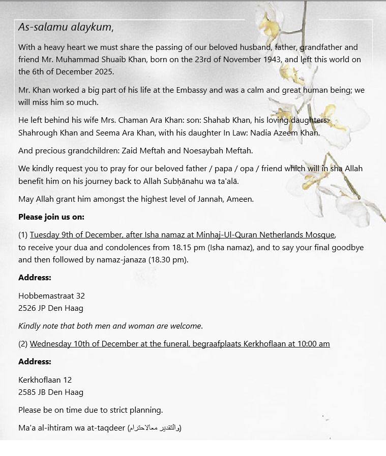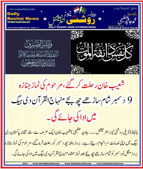 ہالینڈ(ڈیلی روشنی نیوز انٹرنیشنل ۔۔۔ جاوید عظیمی )شعیب خان ایک عرصہ سے سفارتخانہ پاکستان دی ہیگ میں اپنی خدمات سرانجام دیتے رہے۔ بروز ہفتہ چھ دسمبر کو رحلت فرما گئے، مرحوم کی نماز جنازہ بروز منگل نو دسمبر کو شام ساڑھے چھ بجے بعد نماز عشاء منہاج القرآن دی ہیگ میں ادا کی جائے گی۔