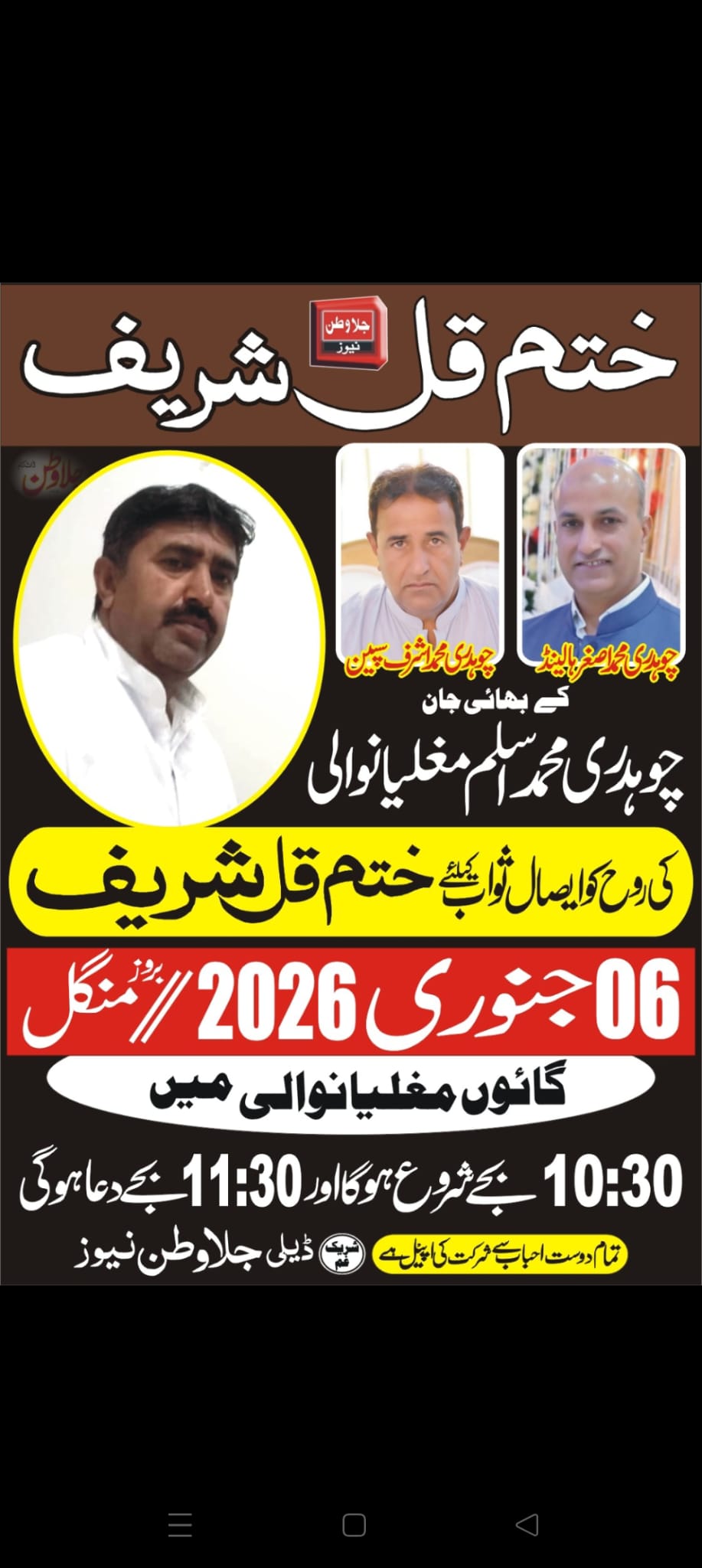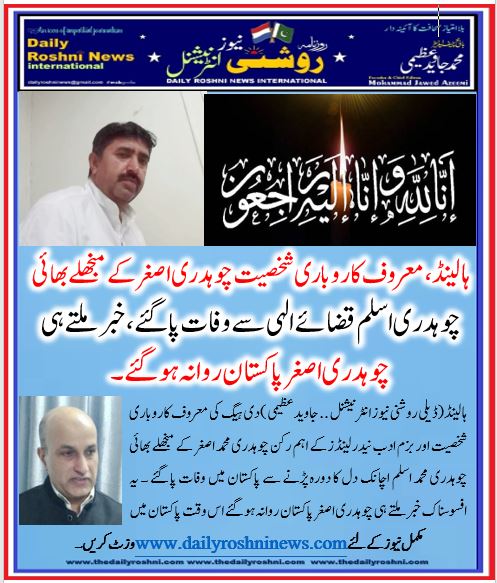 ہالینڈ(ڈیلی روشنی نیوز انٹرنیشنل .. جاوید عظیمی ) دی ہیگ کی معروف کاروباری شخصیت اور بزم ادب نیدرلینڈز کے اہم رکن چوہدری محمد اصغر کے منجھلے بھائی چوہدری محمد اسلم اچانک دل کا دورہ پڑنے سے پاکستان میں وفات پا گئے ۔ یہ افسوسناک خبر ملتے ہی چوہدری اصغر پاکستان روانہ ہو گئے اس وقت پاکستان میں موجود ہیں ۔ذرائع کے مطابق مرحوم چوہدری محمد اسلم کی روح کو ایصال ثواب نذر کرنےکے لئے بروز منگل 6 جنوری 2026 کوپاکستان میں ختم قل شریف کی تقریب منعقد کی جارہی ہے۔یاد رہے مرحوم کے بھائی چوہدری محمد اشرف اسپین سے پہلے ہی پاکستان پہنچ چکے ہیں۔ مزید تفصیلات کے لئے خبر کے نیچے شائع شدہ پوسٹر کامطالعہ کریں۔