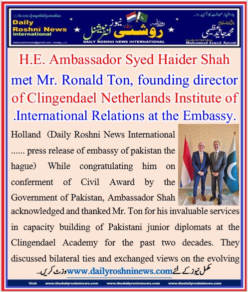 Holland (Daily Roshni News International …… press release of embassy of pakistan the hague) While congratulating him on conferment of Civil Award by the Government of Pakistan, Ambassador Shah acknowledged and thanked Mr. Ton for his invaluable services in capacity building of Pakistani junior diplomats at the Clingendael Academy for the past two decades. They discussed bilateral ties and exchanged views on the evolving regional situation and the role of diplomacy in international affairs.