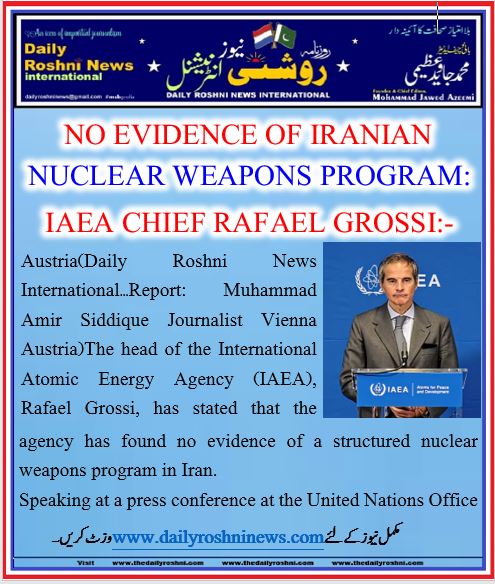 Austria(Daily Roshni News International…Report: Muhammad Amir Siddique Journalist Vienna Austria)The head of the International Atomic Energy Agency (IAEA), Rafael Grossi, has stated that the agency has found no evidence of a structured nuclear weapons program in Iran.